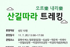 * 교육대상 : 성인* 모집인원 : 10명* 교육기간 : 11. 7.(토) 13:00~17:00 * 장 소 : 용화사 버스 정류장(집결) → 도솔암 → 작은재 → 미래사 → 만월요양원 → 박경리추모공원 → 박경리기념관(해산) * 수 강 료 : 무료* 접수기간 : 10. 13.(화)~선착순 마감※ 접수…