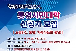 * 모집기간: 2020.08.10(월) ~ 08.21(금)* 교육기간: 2020.09.07 ~ 10.19(총7회, 매주 월요일 19:00~)* 대 상: 통영시민* 비 용: 통영시민학교 입학금 3만원 * 장 소: 통영리스타트플랫폼※신청문의: 통영시 교육체육지원과 평생학습팀 055-650-4751~53※접수방법: 평생학습도시 홈…