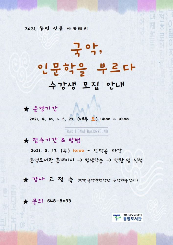 ※ 접수방법 : 통영도서관 홈페이지 -> 평생학습 -> 현황 및 신청