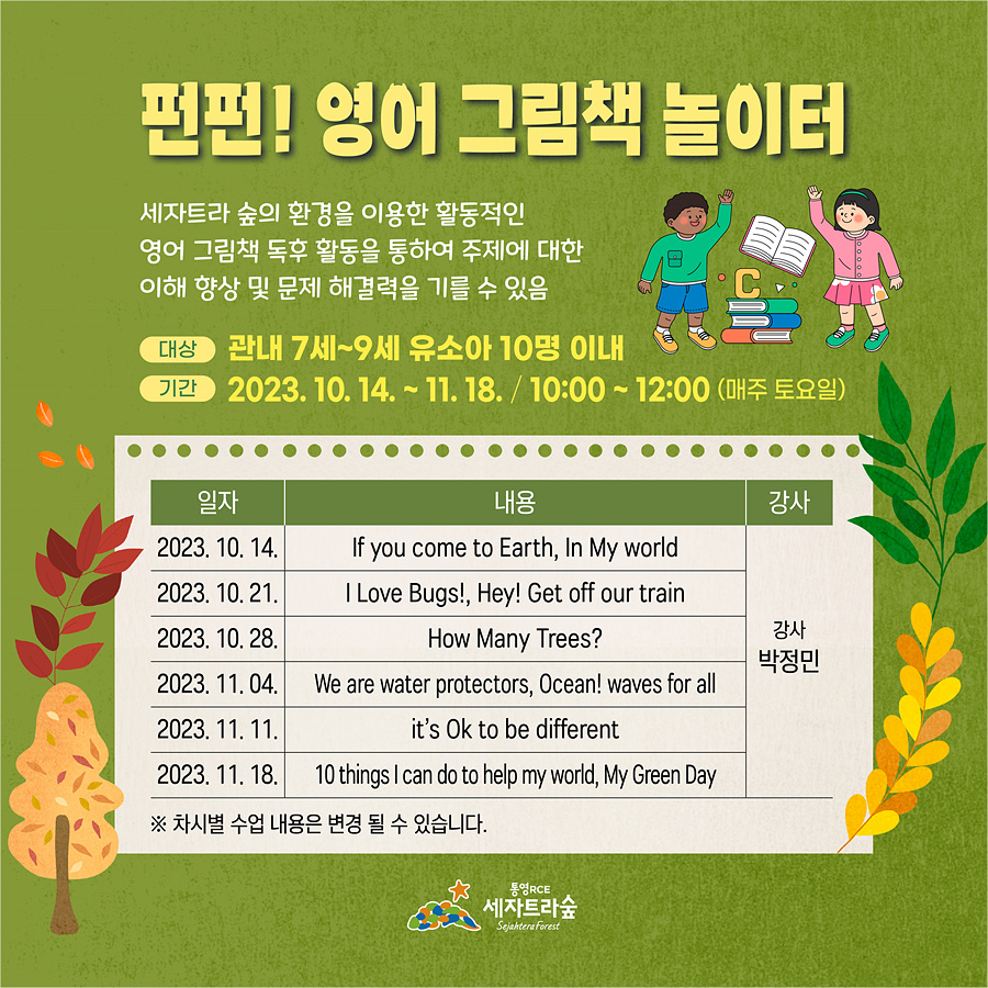 펀펀! 영어 그림책 놀이터에서 즐겁게 배워요! ■영어 그림책 놀이터에서는? ▷세자트라 숲의 환경을 이용한 활동적인 영어 그림책 독후 활동을 통하여 주제(지구의 지속가능성)에 대한 이해 향상과 영어에 대한 친근감을 쌓을 수 있습니다. □ 교육일시 : 2023. 10. 14 ~ 11. 18. 10:00 ~12:00(매주 토요일) □ 교육장소 : 통영RCE 세자트라숲 2층 도서관 □ 모집대상 : 관내 7세~9세(만 6~ 8세) 10명 □ 교육내용 : 지속가능성에 관한 영어 그림책을 읽고 세자트라 숲에서 관련 활동하기 □ 수강료 : 20,000원 □ 신청기간 : 2023. 8.30 (수 )~10.5(목) 12:00 (선착순) □ 신청방법 : 온라인접수 - 통영RCE세자트라숲 홈페이지>교육신청>교육프로그램신청 * 선착순 마감으로 [대기자]상태 확인은 홈페이지 오른쪽 상단의 마이페이지에서 확인해주세요. * 대기자의 경우, 예약이 확정되면 재단에서 연락을 드립니다. 이후 수강료 입금 부탁드립니다. |