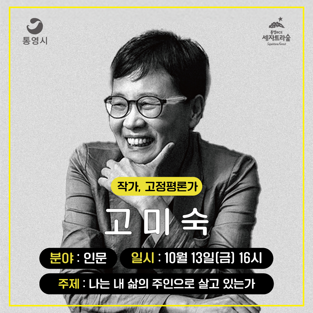 [RCE포럼] 평생학습도시 통영시민과 함께하는 명사초청 강연이란? 사회 각계의 다양한 명사를 초청하여 전문가의 경험과 지식을 대중과 공유함으로써 열린 학습과 교육의 기회를 확대하고자 마련되었습니다. 이를 통해 지역사회의 학습 문화를 촉진하고 이들의 이야기가 통영시민분들께 많은 영감과 동기부여를 줄 수 있으면 좋겠습니다. 그럼 많은 참여와 관심 부탁드립니다. |일시: 2023. 10. 13.(금) 16:00 |장소: 통영RCE세자트라숲 1층 행동하다 홀(강당) <주제: 나는 내 삶의 주인으로 살고 있는가>