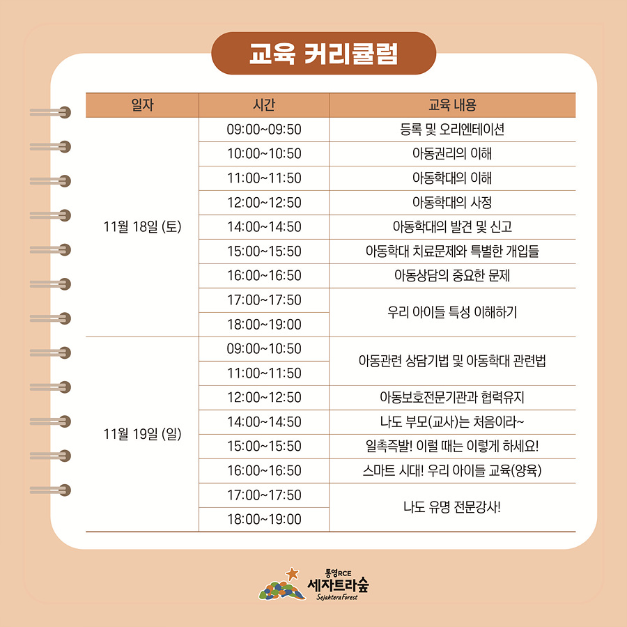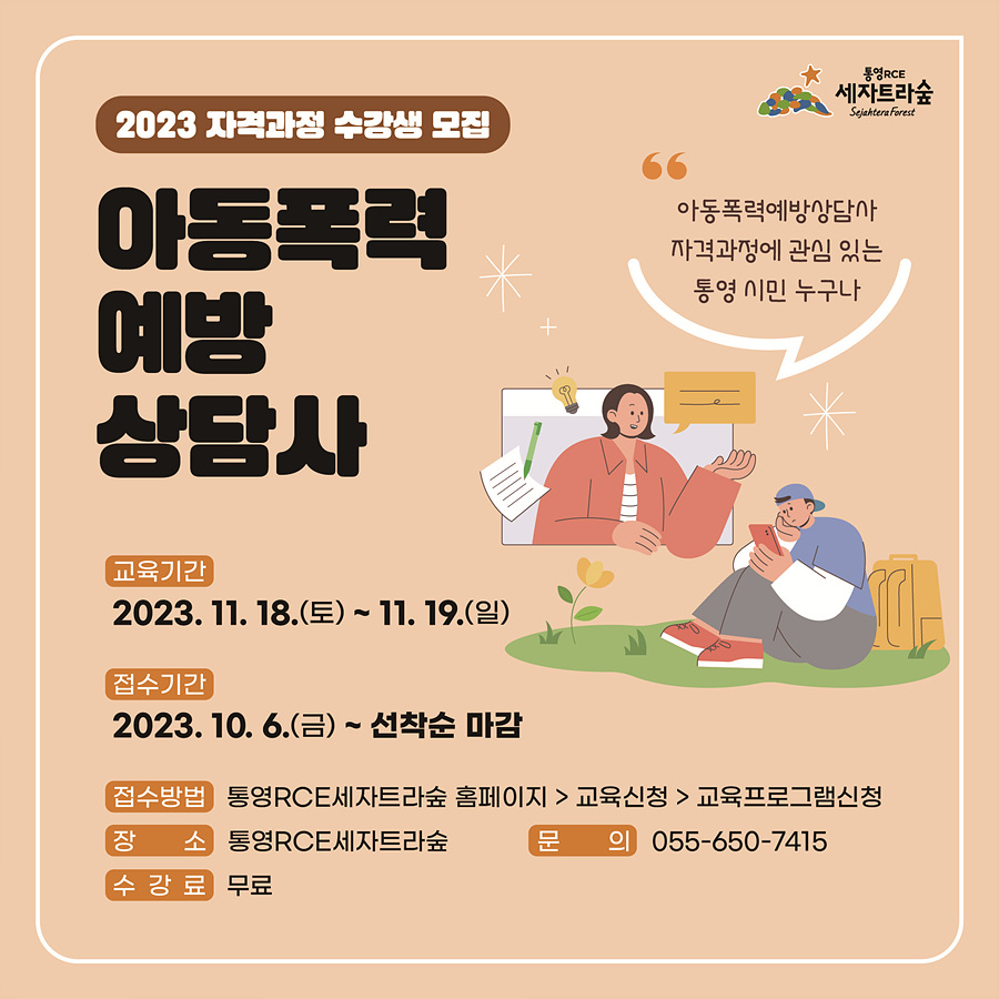 □ 과 정 명 : 아동폭력 예방 상담사 □ 일 시 : 1차시 2023년 11월18일(토) 9:00 ~ 19:00 2차시 2023년 11월19일(일) 9:00 ~ 19:00 □ 장 소 : 통영RCE세자트라숲 2층 질문하다 (통영시 용남해안로 116 세자트라센터) □ 대 상 : 아동폭력예방교육 자격과정에 관심 있는 통영 시민 누구나 □ 모집인원 : 30명 내외 □ 수 강 료 : 무료 (교재 및 자격증 발급비 별도) □ 교육기관 : 두리힐링센터 □ 취득기준 : 80%이상 출석, 필기시험 □ 신청기간 : 2023. 10. 6(금) ~ 선착순 마감 □ 신청방법 : 통영RCE세자트라숲(홈페이지)접수 https://rce.or.kr/>교육신청>교육프로그램 * 선착순 마감으로 [대기자]상태 확인은 홈페이지 오른쪽 상단의 마이페이지에서 확인해주세요. |
