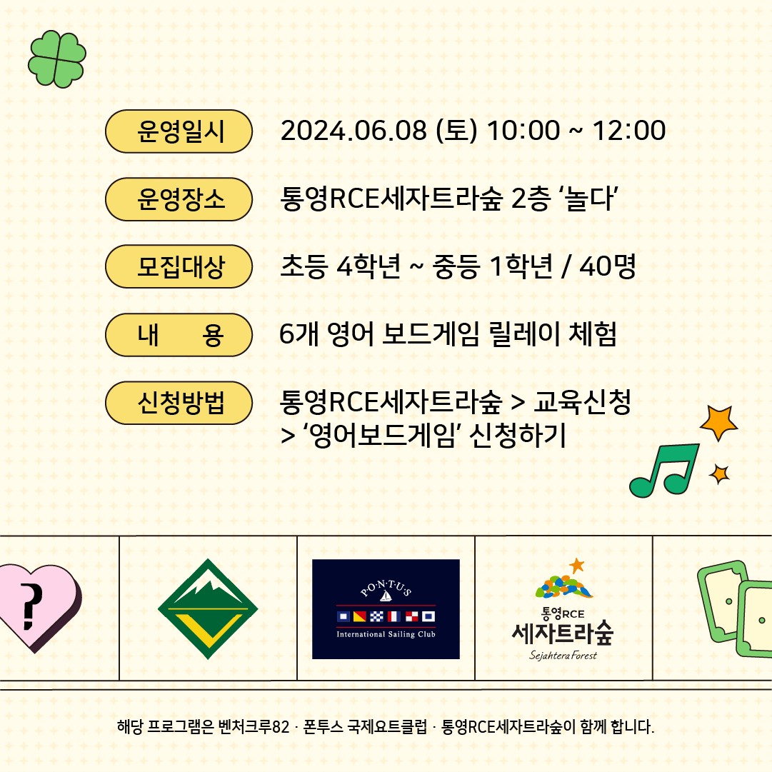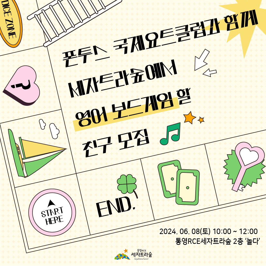 ✿ ✿ ✿ ✿ ✿ ✿ ✿ ✿ ✿ ✿ ✿ ✿주말에 뭐해? 나랑 보드게임하고 놀자!✿ 다가오는 6월 8일! 특별한 계획이 없으신가요? 세자트라숲에서 신나고 유익한 시간을 보내는 건 어떨까요? 주말을 알차게 보내고 싶은 학생들을 위한 특별한 프로그램을 소개합니다. 총 6개의 보드게임을 통해 영어를 자연스럽게 배울 수 있는 주말 프로그램을 운영합니다! 게임을 하며 배우는 영어는 지루하지 않으며, 게임의 즐거움 속에서 새로운 단어와 문장을 익히고, 영어 대화 능력을 향상 시킬 수 있습니다. 더 궁금한 점이 있으면 언제든지 문의해 주시기 바랍니다!