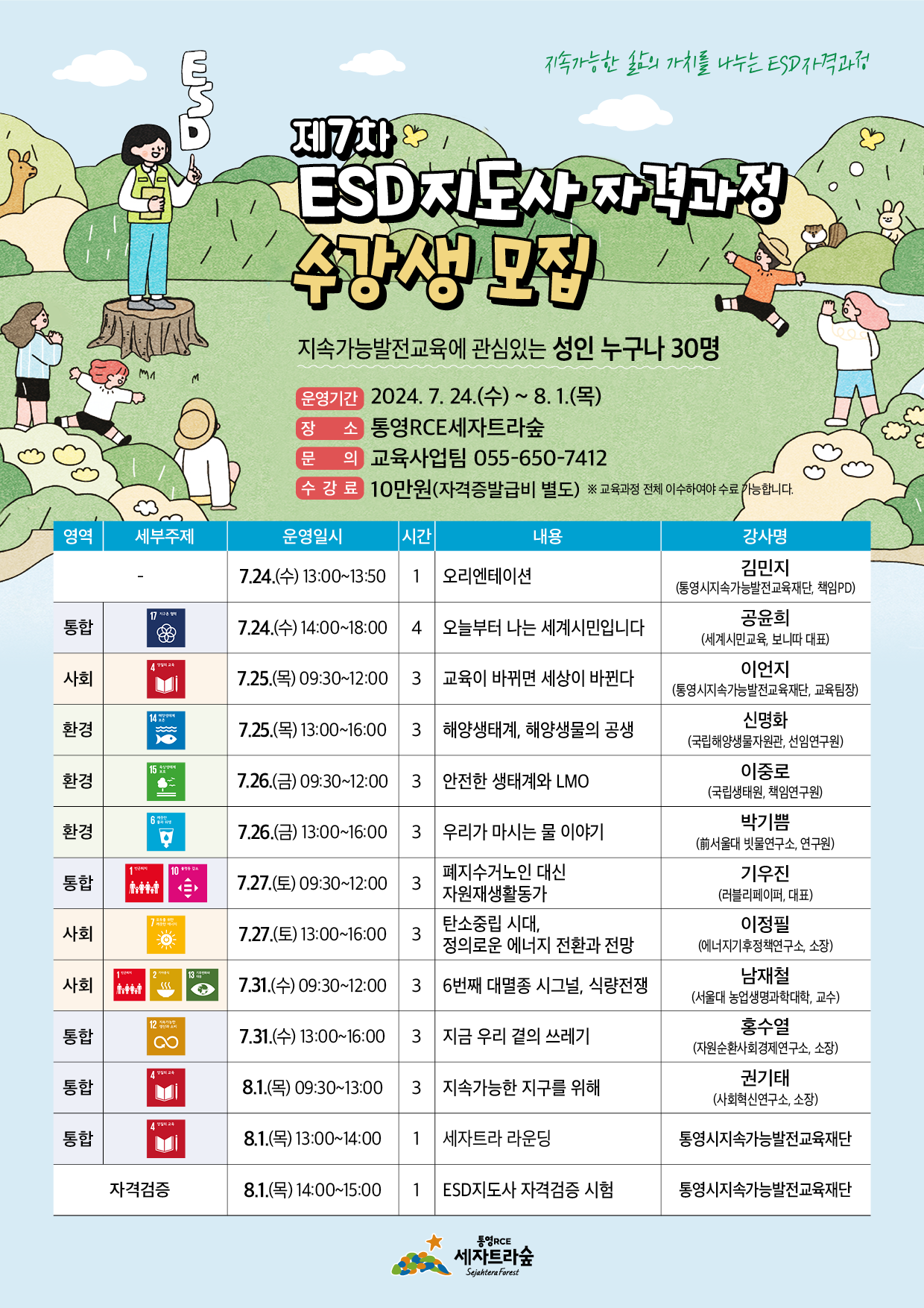 ![]() ✿ ✿ ✿ ✿ ✿ ✿ ✿ ✿ ✿ ✿ ✿ 제7차 ESD지도사 자격과정 수강생을 모집합니다! ✿ ✿ ✿ ✿ ✿ ✿ ✿ ✿ ✿ ✿ ✿ 21세기의 화두인 지속가능발전교육에 대한 전문성을 쌓고 자격증을 취득하여 세자트라숲에서 ESD강사로 활동할 수 있는 기반을 제공합니다. 특히 경력 단절자와 경력 전환을 준비하는 분들에게 배움과 나눔의 평생학습 가치를 실현하며, 지속가능한 평생학습형 일자리를 창출하여 지속가능한 학습 체계를 마련하고 있습니다! * ESD강사는 ESD지도사 자격을 취득 후 강사 자격 심사에 합격한 자에 한하여 활동이 가능합니다.