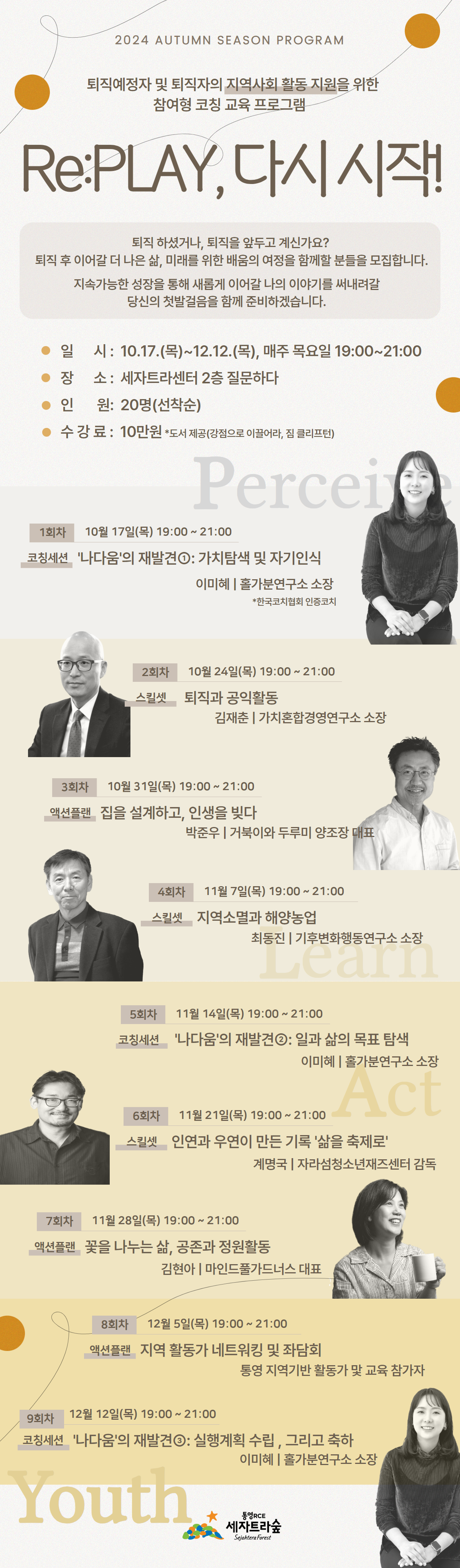∎ 교육일시 | 2024. 10. 17.(목) ~ 12. 12.(목), 19:00 ~ 21:00 매주 목요일 ∎ 교육장소 | 세자트라센터 2층 질문하다 ∎ 모집인원 | 퇴직자 및 퇴직예정자 20명 ∎ 수강비용 | 100,000원 ∎ 신청기간 | 2024. 9. 27.(금), 10:00 ~ 10. 17.(목), 18:00 ※모집인원 마감 시 사전 마감됩니다. ∎ 신청방법 | 온라인접수 *통영RCE세자트라숲 홈페이지 ▶ 교육신청 ▶ 교육프로그램신청 ✔ 수강료 납부 계좌 안내: 농협 301-0081-3715-11 (예금주: 통영시지속가능발전교육재단) ✔ 수강신청 후, 입금 부탁 드립니다. (미신청 입금 시 환불 예정) ✔ 접수자명과 입금자명을 동일하게 수정 부탁드립니다. |
