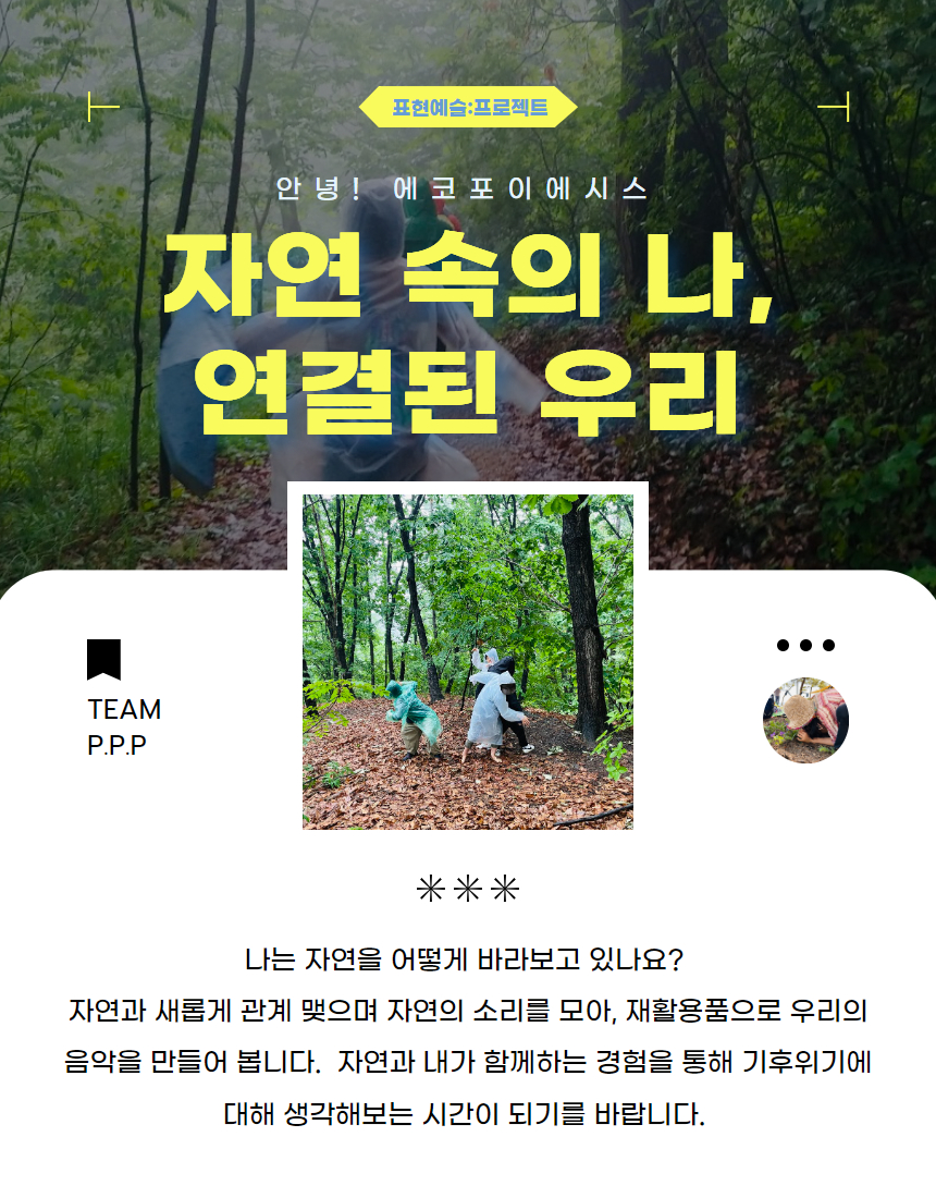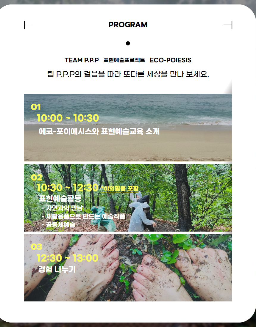 인간이 자연과 분리된 존재가 아니라 자연의 일부로서 연결되어 있다는 생태적인 관점을 가지기 시작할 때 우리는 비로소 행동할 동기와 힘을 얻게 됩니다. 우리는 자연과 어떻게 닮아 있을까요? 우리는 어떻게 함께 순환하고, 서로의 이야기를 나누고 있나요? 자연을 가까이 보고, 깊이 들으며, 누구나 따라하기 쉬운 안내와 함께 예술 작업을 합니다. 생태 공동체의 일부로서 자연과 관계 맺는 경험, 자연 속에서 자신의 창조적 본성을 발견하는 시간으로 여러분을 초대합니다. - Team P.P.P는? 통합예술교육연구소 '포이에시스'에서 E.G.S 표현예술치료 석사과정 P모듈을 수학 중인 학생들로, 표현예술교육 프로그램을 연구하고 진행합니다. - |