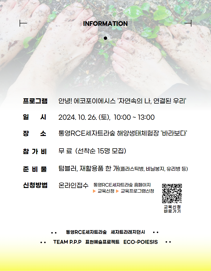 2024년도 세자트라 레지던시로 진행되는 TEAM P.P.P의 표현예술 프로젝트의 참여자를 모집합니다! 표현예술 프로젝트 '자연 속의 나, 연결된 우리'는 자연을 가까이 보고, 깊이 들으며, 누구나 따라하기 쉬운 안내와 함께 예술 작업을 합니다. 자연과 내가 함께하는 경험을 통해 기후위기에 대해 생각해보는 시간이 되기를 바랍니다. * 일 시: 2024. 10. 26. (토) 10:00 ~ 13:00 * 장 소: 통영RCE세자트라숲 해양생태체험장 '바라보다' * 대 상: 일반성인(선착순 15명) * 내 용: 표현예술활동(자연과의 만남, 재활용품으로 만드는 예술작품, 공동체 예술) * 신청방법: 통영RCE세자트라숲 홈페이지 ▶ 교육신청 ▶ 교육프로그램 신청