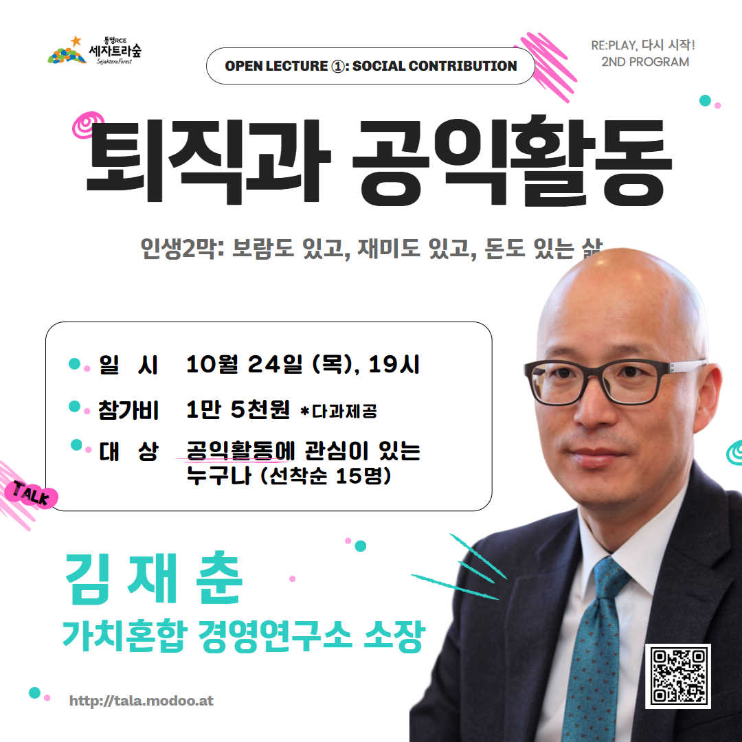 ✿ ✿ ✿ ✿ ✿ ✿ ✿ ✿ ✿ ✿ ✿ 오픈특강 ① 가치혼합경영연구소 김재춘 소장의 <퇴직과 공익활동> 공익활동에 관심이 있으신 분들과 인생 2막을 준비하고 계신 분들을 위해 준비한 오픈특강에 여러분을 초대합니다! - ∎ 교육일시 | 2024. 10. 24.(목), 19:00 ~ 21:00 ∎ 교육장소 | 세자트라센터 2층 질문하다 ∎ 모집인원 | 공익활동에 관심이 있는 누구나(선착순 15명) ∎ 참 가 비 | 15,000원 ∎ 신청방법 | 전화접수 or 온라인접수 *통영RCE세자트라숲 홈페이지 ▶ 교육신청 ▶ 교육프로그램신청 ✔ 수강료 납부 계좌 안내: 농협 301-0081-3715-11 (예금주: 통영시지속가능발전교육재단) ✔ 수강신청 후, 입금 부탁 드립니다. (미신청 입금 시 환불 예정) ✔ 접수자명과 입금자명을 동일하게 수정 부탁드립니다. ✿ ✿ ✿ ✿ ✿ ✿ ✿ ✿ ✿ ✿ ✿ ![]() ✿ ✿ ✿ ✿ ✿ ✿ ✿ ✿ ✿ ✿ ✿ 김재춘(밝은★별)