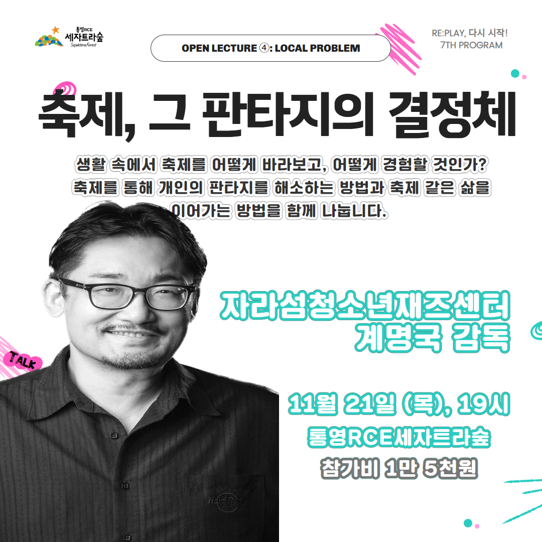 ✿ ✿ ✿ ✿ ✿ ✿ ✿ ✿ ✿ ✿ ✿ 오픈특강 ④ 자라섬청소년재즈센터 계명국 감독의 <축제, 그 판타지의 결정체> 생활 속에서 축제를 어떻게 바라보고, 어떻게 경험할 것인가? 축제를 통해 개인의 판타지를 해소하는 방법과 축제같은 삶을 이어가는 방법을 함께 나눕니다. 삶을 축제로, 축제같은 삶을 꿈꾸는 모두를 초대합니다. - ∎ 교육일시 | 2024. 11. 21.(목), 19:00 ~ 21:00 ∎ 교육장소 | 세자트라센터 2층 질문하다 ∎ 모집인원 | 새로운 도전을 꿈꾸는 누구나(선착순 10명) ∎ 참 가 비 | 15,000원 ∎ 신청방법 | 전화접수 or 온라인접수 *통영RCE세자트라숲 홈페이지 ▶ 교육신청 ▶ 교육프로그램신청 ✔ 수강료 납부 계좌 안내: 농협 301-0081-3715-11 (예금주: 통영시지속가능발전교육재단) ✔ 수강신청 후, 입금 부탁 드립니다. (미신청 입금 시 환불 예정) ✔ 접수자명과 입금자명을 동일하게 수정 부탁드립니다. ✿ ✿ ✿ ✿ ✿ ✿ ✿ ✿ ✿ ✿ ✿