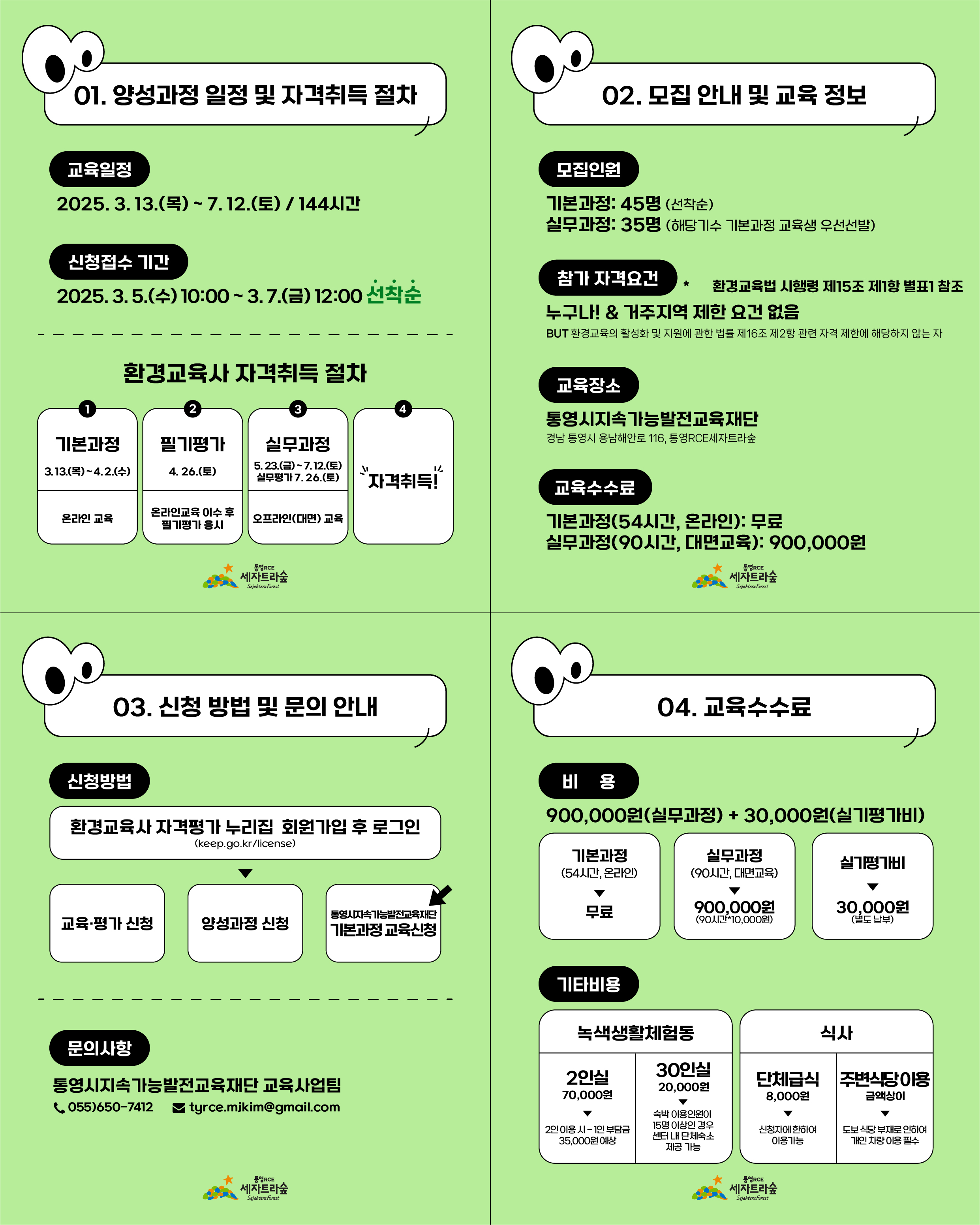 TEF-2025-007호 2025년 제1차 환경교육사 3급 양성과정 시행계획 공고 환경교육법 제16조 및 같은 법 시행령 제15조에 따라 『2025년 제1차 환경교육사 3급 양성과정』 시행계획을 다음과 같이 공고합니다. 2025년 2월 13일환경교육사 3급 양성기관 통영시지속가능발전교육재단 이사장