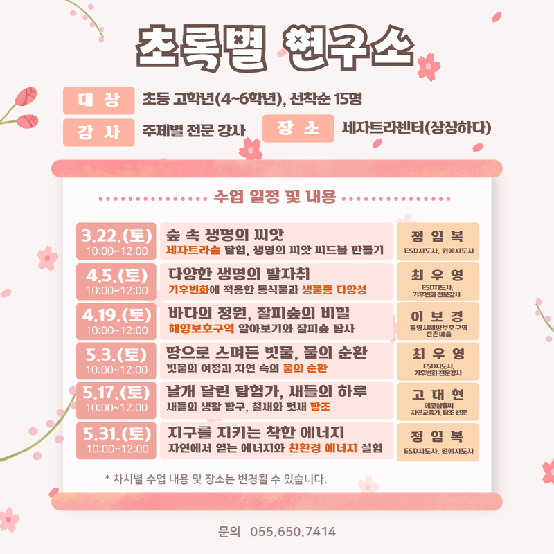 ∎ 교육일시 | 2025. 3. 22.(토) ~ 5. 31.(토), 10:00 ~ 12:00 격주 토요일 ∎ 모집인원 | 초등 4~6학년, 15명 선착순 ∎ 수강비용 | 60,000원 ∎ 신청기간 | 2025. 3. 6.(목), 10:00 ~ 3. 21.(금), 16:00 ※모집인원 마감 시 사전 마감됩니다. ∎ 신청방법 | 온라인접수 *통영RCE세자트라숲 홈페이지 ▶ 교육신청 ▶ 교육프로그램신청 ✔ 수강료 납부 계좌 안내: 농협 301-0081-3715-11 (예금주: 통영시지속가능발전교육재단) ✔ 수강신청 후, 입금 부탁 드립니다. (미신청 입금 시 환불 예정) ✔ 접수자명과 입금자명을 동일하게 수정 부탁드립니다. |
