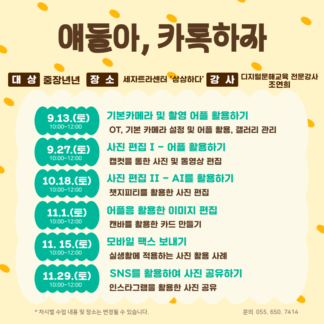 스마트폰 사용 이제 겁내지 마세요! 똑똑한 스마트폰 사용법을 쉽게 알려드립니다. ♥가을학기 ‘얘들아, 카톡하자!'의 작은 목표♥ ① 나도 AI 활용할 수 있다! Chat GPT와 친해지기 ② SNS를 활용한 사진 공유 및 소통하기 #통영RCE세자트라숲 #디지털문해교육 - 얘들아, 카톡하자! 신중년 및 중장년층의 디지털 문해력 향상을 위한 교육 프로그램입니다. * 준비물: 개인 스마트폰