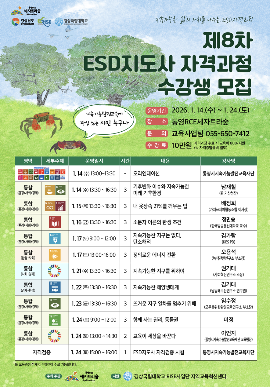 ![]() ✿ ✿ ✿ ✿ ✿ ✿ ✿ ✿ ✿ ✿ ✿ 제8차 ESD지도사 자격과정 수강생을 모집합니다! ✿ ✿ ✿ ✿ ✿ ✿ ✿ ✿ ✿ ✿ ✿ 21세기의 화두인 지속가능발전교육에 대한 전문성을 쌓고 자격증을 취득하여 세자트라숲에서 ESD강사로 활동할 수 있는 기반을 제공합니다. 특히 경력 단절자와 경력 전환을 준비하는 분들에게 배움과 나눔의 평생학습 가치를 실현하며, 지속가능한 평생학습형 일자리를 창출하여 지속가능한 학습 체계를 마련하고 있습니다! * ESD강사는 ESD지도사 자격을 취득 후 강사 자격 심사에 합격한 자에 한하여 활동이 가능합니다.