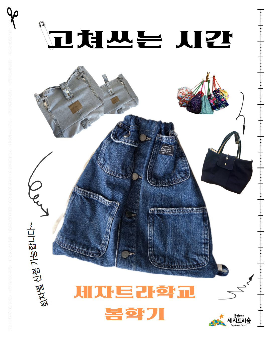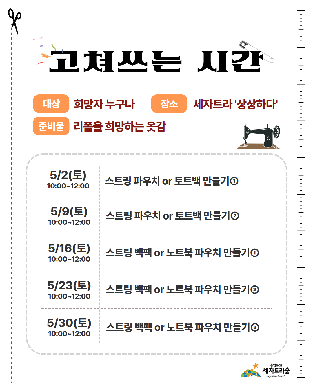 버려지는 옷을 다시 살려, 나만의 디자인으로! 의류 리폼과 자수를 배우며 지속가능한 패션을 실천해보세요. - 에코리페어링워크숍 - 고쳐쓰는 시간 누구나 참여할 수 있는, 생활 속 작은 실천을 배우는 업사이클링 수선 워크숍입니다. * 준비물: 리폼을 희망하는 옷감 - ∎ 교육일시 | 2026. 5. 2.(토) ~ 5. 30.(토), 10:00 ~ 12:00 매주 토요일 ∎ 모집인원 | 참여 희망자 누구나(선착순 10명) ∎ 수강비용 | 60,000원(재료비 포함) ∎ 교육강사 | 재봉틀공방 '보통의 시선' 대표 박덕희 ∎ 준 비 물 | 리폼을 희망하는 옷감 ∎ 교육내용 | 생활 속 작은 실천을 배우는 업사이클링 수선 워크숍 ∎ 신청방법 | 온라인접수 *통영RCE세자트라숲 홈페이지 ▶ 교육신청 ▶ 교육프로그램신청 ∎ 신청문의 | 055-650-7412 ✔ 수강료 납부 계좌 안내: 농협 301-0081-3715-11 (예금주: 통영시지속가능발전교육재단) ✔ 수강신청 후, 입금 부탁 드립니다. (미신청 입금 시 환불 예정) ✔ 접수자명과 입금자명을 동일하게 수정 부탁드립니다.