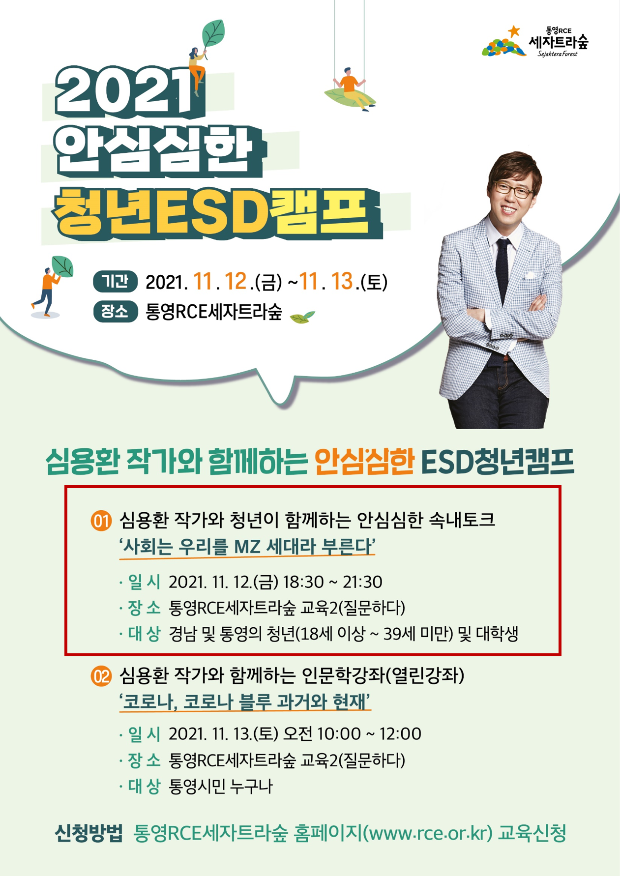 2021 안심심한 청년 ESD캠프 1부 심용환작가와 청년이 함께하는 속내토크 '사회는 우리를 MZ세대라 부른다' 행 사 명 : 2021 안심심한 청년ESD캠프 (심용환작가와 함께하는 안심심한 속내토크) 주 제 : 사회는 우리를 MZ세대라 부른다 일 시 : 2021. 11. 12. (금), 18:30 ~ 종료시까지 대 상 : 경남 및 통영 청년(만18세 이상 ~ 39세 미만) , 대학생 등 문 의: 055-650-7411(통영RCE) 참여링크 : https://forms.gle/RxLSPBbLhZhkz83K6 * 반드시 홈페이지의 마이페이지-프로그램 신청 내역에서 신청상태를 확인하시기 바랍니다. * 대기자는 예약완료자가 취소하면 순번에 의해 예약완료자로 처리됩니다.
