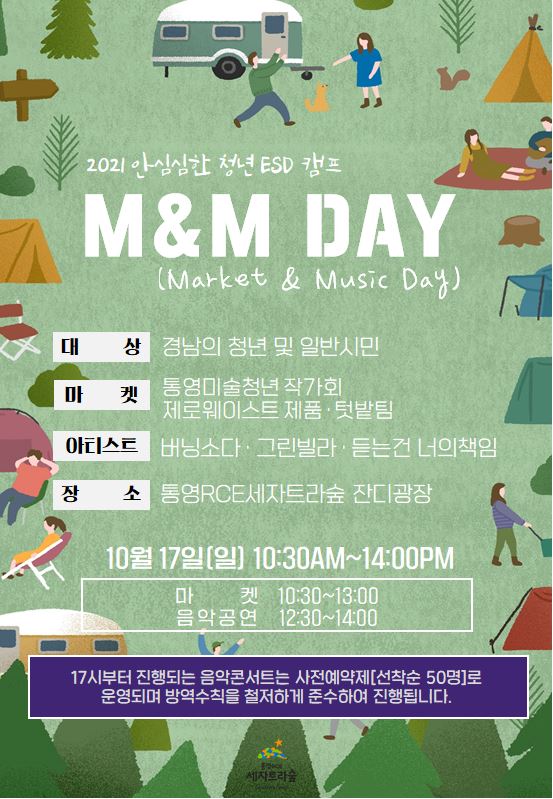 * 본 행사는 16일 비소식으로 인해 10월 17일(일)로 변경되었습니다. 갈대로 가득찬 가을의 통영RCE세자트라숲, 10월에도 마음 따뜻한 선율과 함께 돌아왔습니다:) 코로나19로 지친 우리의 일상에 경남의 아름다운 아티스트들이 위로를 전하고자 합니다. 통영 청년들의 미술작품들과 플라스틱 제로를 향한 세자트라의 제로웨이스트 상품, 텃밭팀에서 직접 키운 로컬 제품들까지 ! 비가 개인 후 맑은 가을 오후에 우리 함께 만나요. <마켓부스운영> 일시: 2021. 10. 17.(일) 10:30-13:00 참여마켓: 통영미술청년작가회, 씨앗상점 제로웨이스트 물품, 텃밭팀 <음악콘서트> 일시 : 2021. 10. 17.(일) 12:30-14:00 아티스트 : 버닝소다, 그린빌라, 듣는건 너의 책임 준비물 : 돗자리, 혹시나 있을 모기에게 대처할 수 있는 용품 (모기향은 피울 수 없습니다!) * 본 행사는 일회용품 없는 행사로 참여하실 때 꼭! 다회용품을 챙겨서 와주세요 :) * 5인 이상은 신청이 불가합니다. 4인까지 가능합니다! * 본 행사는 방역지침을 준수하여 진행할 예정입니다.