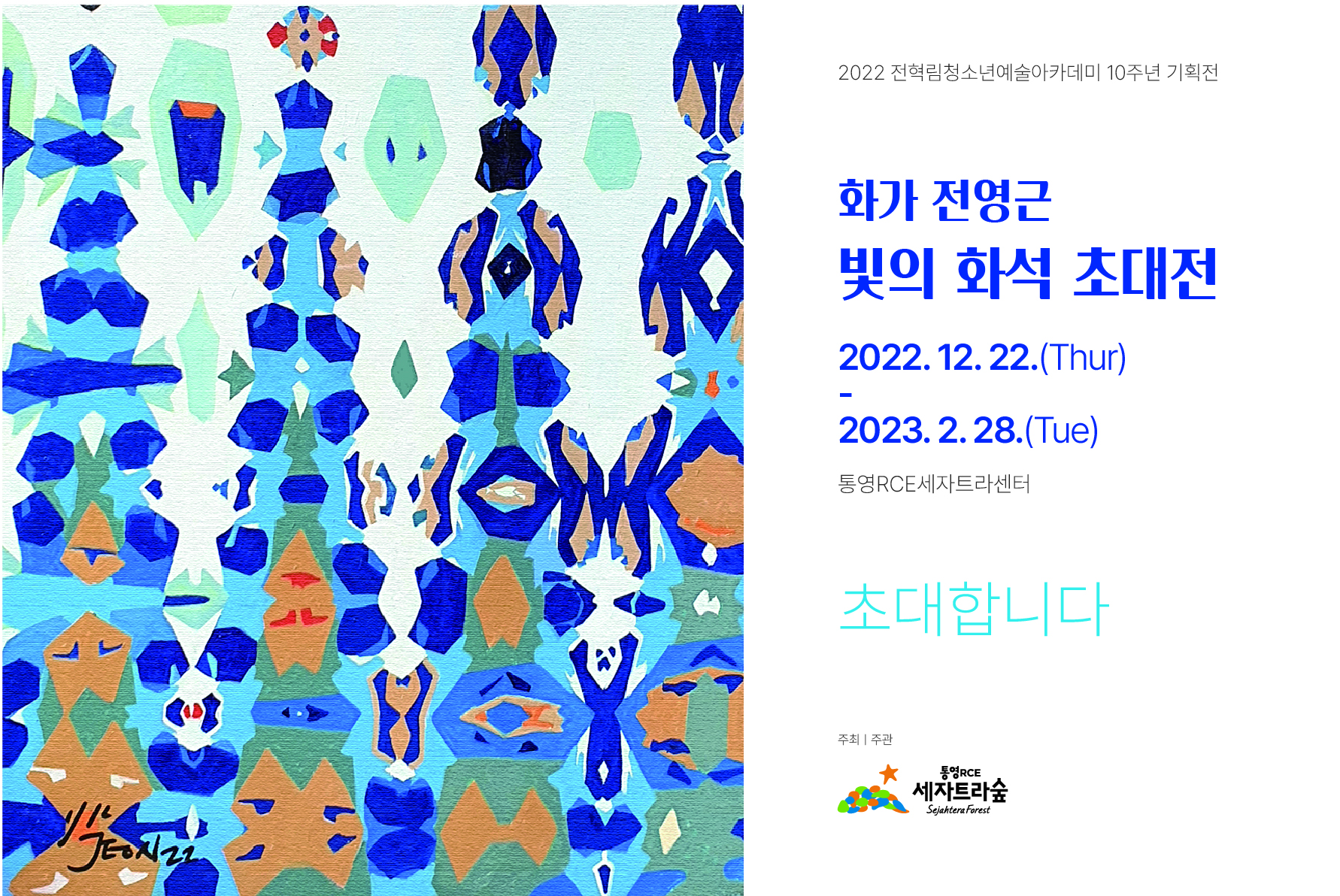 전혁림청소년미술아카데미 10주년 기념 전영근 초대전 「빛의 화석」에 여러분을 초대합니다. 전시기간 │ 2022. 12. 22. - 2023. 2. 28. 10:00 - 17:00 (매주 월요일, 설날 공휴일(2023. 1. 21. - 1. 24.) 휴무) 전시장소 │통영RCE세자트라숲 세자트라센터 1층 행동하다 [초대하는 글] 차갑고 푸르른 향기가 완연한 겨울입니다. 2022년을 정리하고 2023년을 시작하는 이때, 통영RCE세자트라숲에서 전혁림청소년아카데미 10주년을 기념하여 전영근 초대전 '빛의화석'을 개최합니다. 이번 초대전은 지난 10년 동안 우리 통영 아이들이 바다화가로 자라날 수 있도록 빛나는 미래를 줄기차게 이끌어준 전영근화백에 대한 감사와 존경을 담아 기획하였습니다. 통영RCE세자트라숲으로 성큼 걸음하셔서 아름다운 작품을 감상하시길 바랍니다. - 통영RCE세자트라숲 이사장 박은경 - [작가노트] 빛으로 그려진 모든 것.. 노을을 담고 일렁이는 고향바다의 4계절 뒷산의 무성했던 숲 개울에 스며들어 졸졸 거리던 마을 이야기 빛으로 그려진 삼라의 경이로운 기억들을 나의 손으로 그려내 보고 싶다. - 작가 전영근 - |