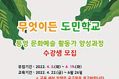 「무엇이든 도민학교」통영 문화예술 활동가 양성과정은 통영을 빛낸 문화예술인들의 예술적 업적에 대하여 깊이 있게 공부하고 그들의 창작혼이 서려 있는 생가, 기념관, 문학관, 문학비(시비)등 현장 방문을 통한 자부와 긍지를 가질 수 있는 강좌로 다음과 같이 수강생을 모집하오니, 많은 참여 바랍니다. * 사업기간 : 2022. 4. 22.(금) ~ 6. 26…