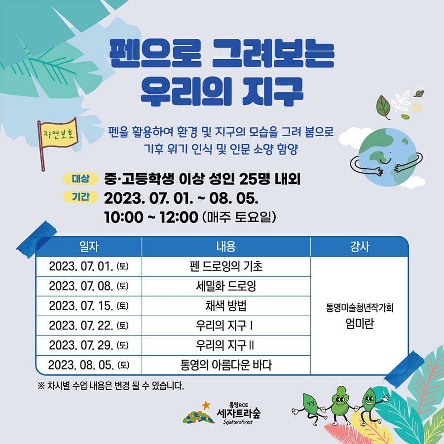 기후위기에 직면한 현 상황, 우리가 직접 지속가능한 지구의 모습을 그려 봅시다! ■펜으로 그려보는 우리의 지구에서는? ▷펜을 활용하여 환경 및 지구의 모습을 그려 봄으로 기후 위기를 알아보고, 펜드로잉의 기초를 배워보는 지속가능 교육 프로그램입니다. □교육일시 : 2023. 07. 01. ~ 08. 05. 10:00 ~ 12:00 (매주 토요일) □교육장소 : 통영RCE 세자트라숲 2층 상상하다 □모집인원 : 중고등 이상 성인 20명 내외 □수강비용 : 20,000원 □재료비용 : 10,000원 □교육내용 : 펜드로잉 기초 수업 및 기후위기 이해 □신청기간 : 2023. 06. 03. ~ 06. 30. □신청방법 : 온라인접수 - 통영RCE세자트라숲 홈페이지>교육신청>교육프로그램신청 전화접수 - 055.650.7415 ※ 수강료 납부 계좌 안내 : (농협) 301-0081-3715-11 통영시지속가능발전교육재단 ※ 6/30(금) 18:00 이전 취소 시 환불 가능합니다. ※ 접수자명과 입금자명이 동일하게 입금 부탁드립니다. * 선착순 마감으로 [대기자]상태 확인은 홈페이지 오른쪽 상단의 마이페이지에서 확인해주세요. * 대기자의 경우, 예약이 확정되면 재단에서 연락을 드립니다. 이후 수강료 입금 부탁드립니다. ※셔틀버스 이용안내